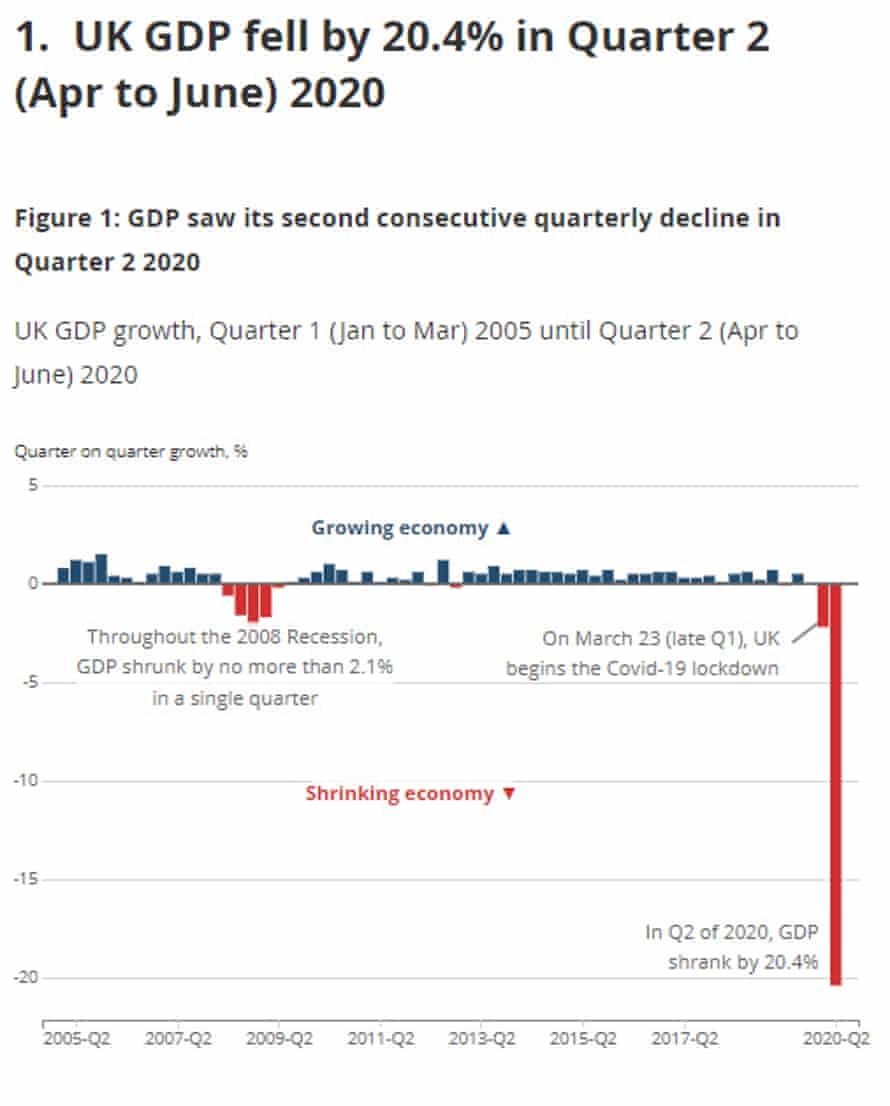 Uk Falls Into Recession As Gdp Tumbles 20 4 In April June As It Happened Business The Guardian